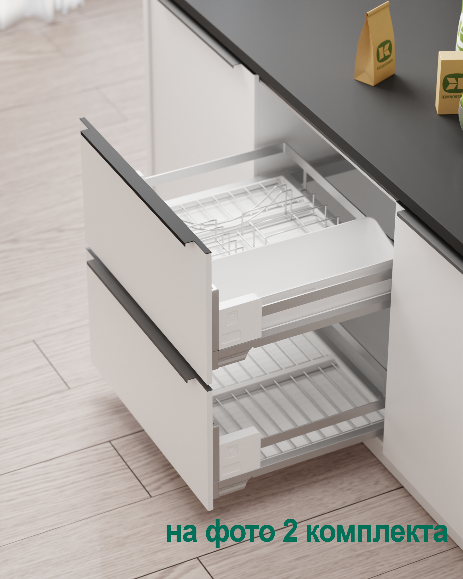 Ответ: Используйте модульную систему diningAGENT от Kesseböhmer — с полным выдвижением, возможностью мытья поддонов в посудомойке, защитой от царапин и функцией сервировочного подноса. Подходит для тарелок, блюд, чашек и столовых приборов. Доступна в цветах титан и антрацит, с доводчиком и нагрузкой до 12 кг.