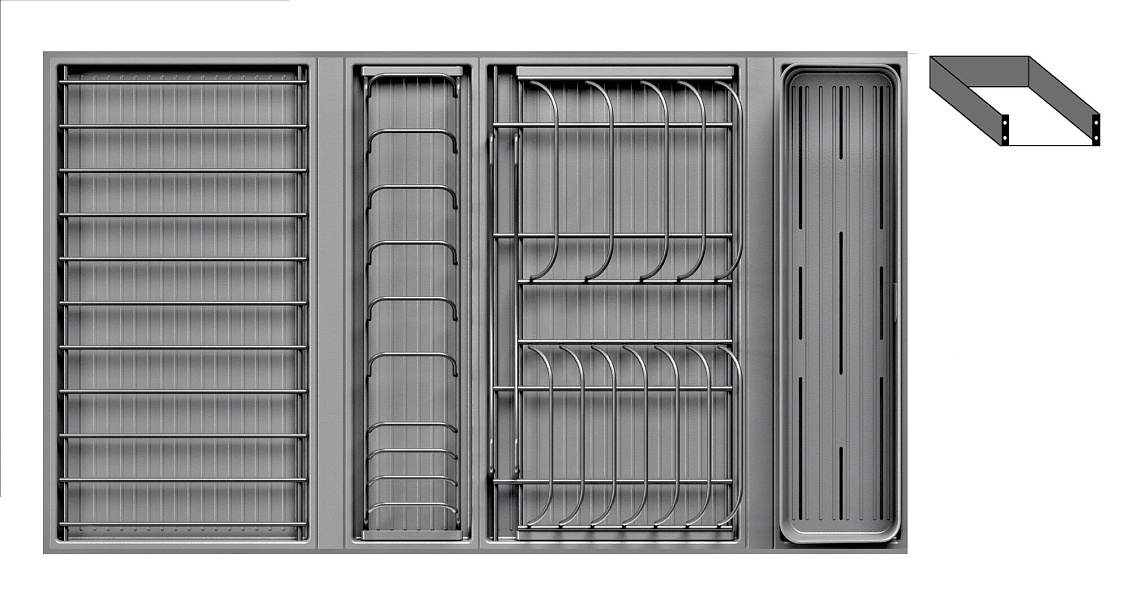 - 1 большой модуль для посуды + 1 большой модуль с решеткой + 1 малый модуль для посуды + модуль для столовых приборов