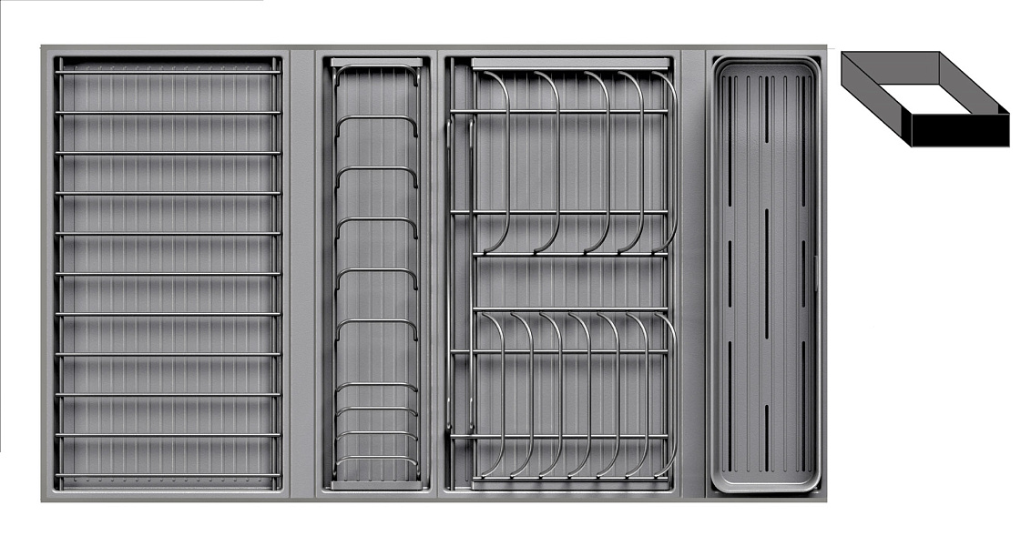 • 1 большой модуль для посуды + 1 малый модуль с решеткой + модуль для столовых приборов